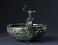 Hemispherical shaped bronze cup with a vertical handle sourmonted by a bull's head.