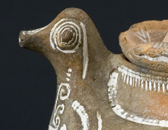 The vessel has a shallow body. A head of a bird as well as tail and wings are presented in relief.